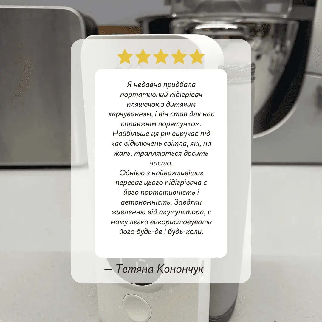 Наш компактний підігрівач пляшечок – це найкраще рішення для сучасних батьків, які хочуть забезпечити своєму малюкові комфортне годування в будь-який час та в будь-якому місці. Завдяки акумулятору ємністю 6000 мАг, ви можете бути впевнені, що підігрівач працюватиме протягом тривалого часу без необхідності частого підзаряджання. Він є компактним і портативним підігрівачем для пляшечок, який призначений для забезпечення тепла без необхідності використання громіздких шнурів або розеток.